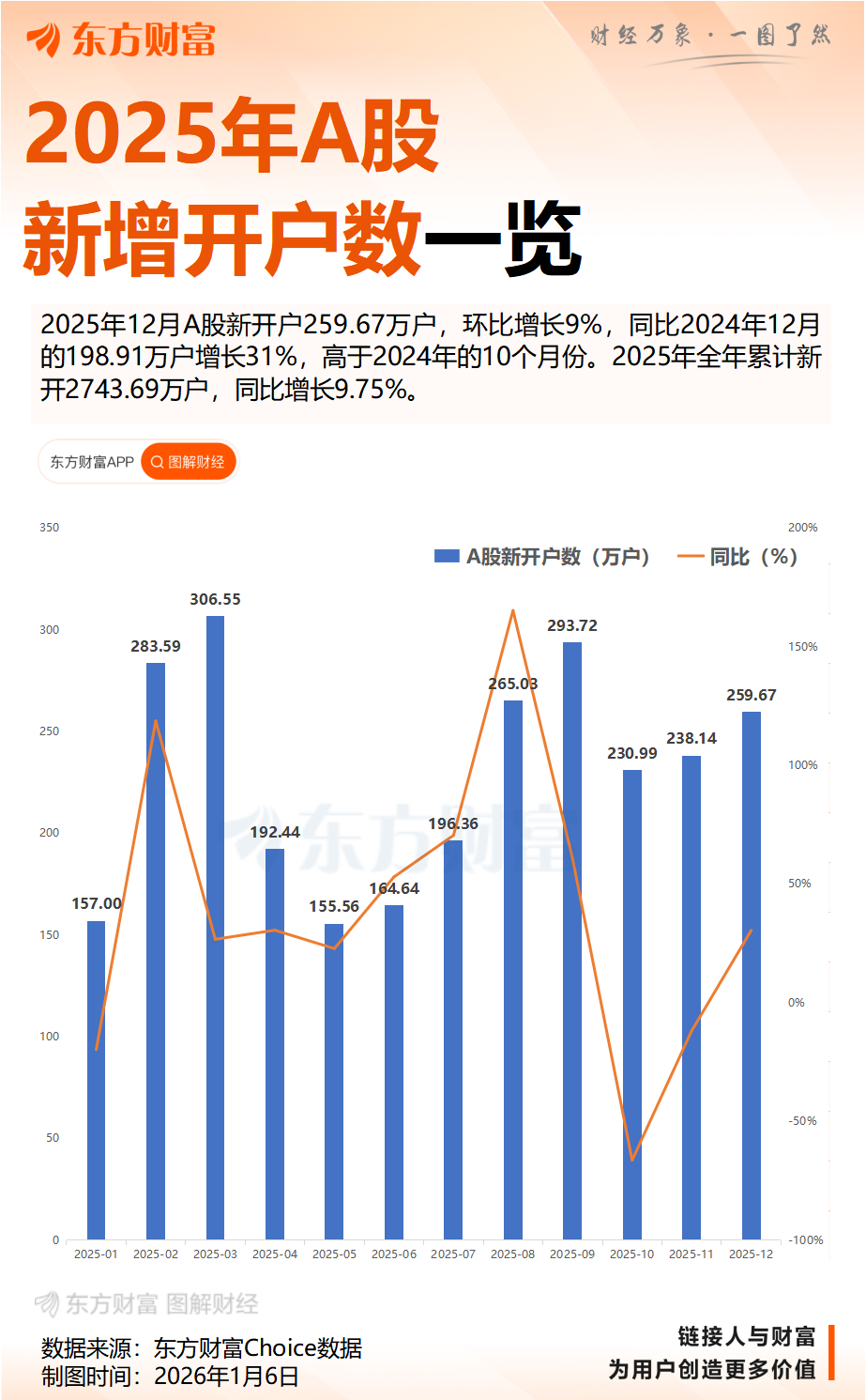 元旦之后A股“牛气”持续,到1月6日沪指实现13连阳,并创出本轮牛市新高。市场向上的背后,是投资者对股市参与热情的持续高涨。 上交所数据显示,2025年全年A股新开账户数同比增长9.75%。其中个人投资者一年增加2733.24万户,同比增长9.67%;而机构新开A股账户10.4539万户,同比增长34.91%。 散户、机构都在入场 2025年12月份A股新开户259.67万户,环比增长9%,较2024年12月的198.91万户增长30.55%。由此,2025年A股新开户总数出炉,达到2743.69万户,同比增长9.75%。 在12月份新开的A股账户中,个人投资者新开258.56万户,机构新开1.11万户,继2025年9月份之后重回1万户以上。 2025年全年,个人投资者合计新开A股账户2733.24万户,同比增长9.67%;机构新开A股账户10.4539万户,同比增长34.91%。截至2025年底,A股市场累计总户数为39742.96万户,其中个人投资者总户数为39617.2159万户。 从2025年每个月A股新开户情况来看,去年3月份开户数最多,也是唯一单月开户数超过300万户的月份,开户数达到306.55万户;其次则是2025年9月份,新开户数为293.72万户;再是2025年2月份,新开A股账户数283.59万户。 呈现的趋势是1月份开始逐步增加,到3月份创出年内单月最高。从沪指走势来看,1月份下跌3.02%后,2月份上涨2.16%,3月份微涨0.45%。 在4月份行情回调的情况下,开户数也出现下降,单月新开A股账户192.44万户,环比3月份减少59.3%。5月份,沪指虽然上涨2.09%,但是新开户数持续下降,以155.56万户的新开户数量创下年内单月最低开户数。 在行情持续上涨之下,6月至9月份的新开户数量也持续增加,分别为164.64万户、196.36万户、265.03万户、293.72。但是10月份新开A股账户数量下降,新开户230.99万户,较9月份减少21%,同比下降66%。 11月份和12月份,A股新开账户数又逐渐增加,分别新开238.14万户、259.67万户。 业绩博弈情绪升温 市场的开户热情,一定程度与A股行情相关联。2025年,A股市场震荡上行,一度突破4000点,全年沪指上涨18.41%,相较2024年的涨幅增加了近6个百分点。 2026年元旦节后首个交易日(1月5日),沪指再度站上4000点,并在1月6日创出新高4083.67点。 后市行情将如何演绎? 银河证券首席策略分析师杨超发布研报称,从元旦节后来看,假期期间港股市场与人民币汇率走强表现有助于提振投资者信心,A股市场或将延续结构性行情。后续上行节奏还要观察政策预期与产业趋势突破。同时,仍需关注海外地缘风险等不确定性因素的短期扰动。 华金证券策略团队也称,当前来看,今年元旦后A股春季行情进行中,可能震荡偏强。节后科技成长和部分周期行业可能相对占优。 “展望1月,A股延续上行趋势,继续演绎春季攻势的概率较高。”招商证券策略团队分析称,基本面方面,开年之后,地方政府专项债发行有望提速,中央预算内投资加两重项目有望提速,政府开支和投资数据有望回暖。基本面将会走向边际好转。1月是上市公司业绩预告披露时间窗口,2025年四季度由于去年同期业绩基数较低,年报业绩预报披露的同比增速有望明显回升。资金面方面,由于赚钱效应积累,开年后国内各路资金进一步加仓A股的概率较高。近期人民币升值较为明显,在经济预期转暖后,外资重新回流A股概率也明显提升。 招商证券策略团队认为,1月,围绕业绩披露的博弈情绪将会明显升温。业绩超预期或者业绩披露后靴子落地的方向值得重点关注。总体来看,以商业航天、AI应用、AI算力和半导体设备为代表的科技、工业金属为代表的资源品仍然是1月的主战场,除此之外,服务业消费和非银金融仍然是1月的值得关注的重点方向。 展望2026年,杨超认为,“十五五”开局之年改革政策预期强化,人民币汇率向上等价格因素支撑流动性向好,市场信心有望得到提振。可关注盈利修复逻辑下,具备业绩兑现能力的科技龙头、受益于价格水平回暖预期的周期板块。