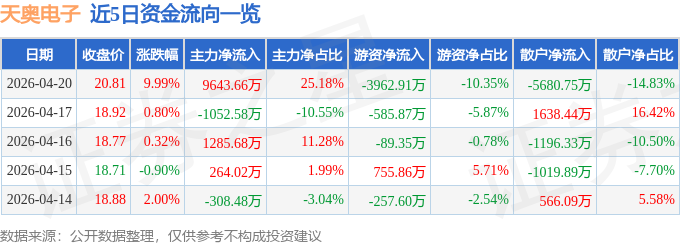 证券之星消息,天奥电子4月20日涨停收盘,收盘价20.81元。该股于13点24分涨停,未打开涨停,截止收盘封单资金为2259.34万元,占其流通市值0.26%。 今日天奥电子(002935)涨停的可能因素有:公司治理持续优化,2025年Q3净利润同比大增1281%�C1475%,扣非净利增长超170倍;铯原子钟获电信进网许可,晶体器件国产替代加速;产品深度参与北斗导航、载人航天等国家重大工程,并积极拓展低轨卫星时间频率配套应用;叠加商业航天与军工电子板块近期政策与产业热度提升,形成主题共振。 4月20日的资金流向数据方面,主力资金净流入9643.66万元,占总成交额25.18%,游资资金净流出3962.91万元,占总成交额10.35%,散户资金净流出5680.75万元,占总成交额14.83%。 近5日资金流向一览见下表: