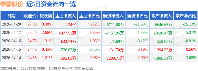 证券之星消息,泰嘉股份4月20日涨停收盘,收盘价27.98元。该股于9点25分涨停,未打开涨停,截止收盘封单资金为1.18亿元,占其流通市值1.68%。 今日泰嘉股份(002843)涨停的可能因素有:1、大功率电源业务覆盖数据中心服务器电源模块及光伏/储能电源,服务头部客户并按订单有序生产;2、锯切业务为国内双金属带锯条龙头,系中国运载火箭技术研究院合格供应商,具备商业航天概念;3、加速全球化布局,新增泰国孙公司投资至1.5亿元、设立德国销售子公司,完善全球供应链;4、终止低效募投项目,规范资金管理(12.77亿元募集资金专户管理),聚焦‘锯切+电源’双主业;5、完成非主业基金份额转让及全资子公司吸收合并,优化资产与组织结构。 4月20日的资金流向数据方面,主力资金净流入1.24亿元,占总成交额46.72%,游资资金净流出5711.68万元,占总成交额21.59%,散户资金净流出6646.68万元,占总成交额25.13%。 近5日资金流向一览见下表: